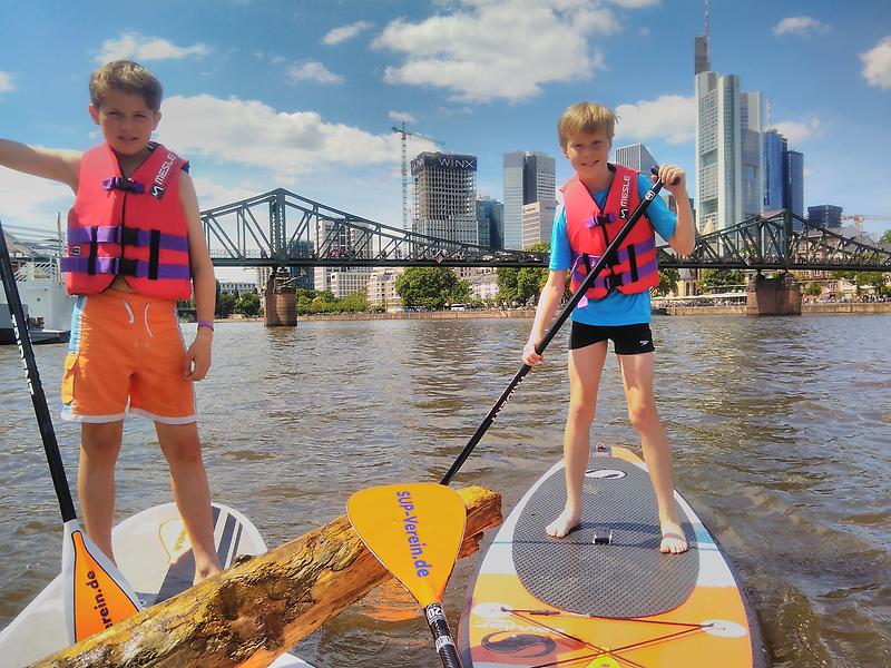 Müllbeute von L. und V.; Main-Frankfurt Stand-UP-Paddeln-mit-Kinder Skyline