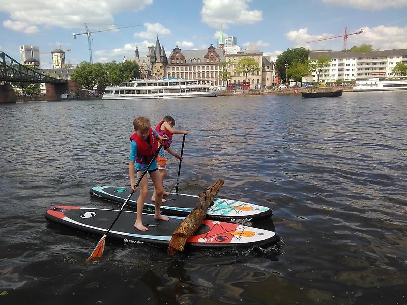 Müllbeute von L. und V.; Main-Frankfurt Muellbeseitigung-auf-SUP-Katamaran